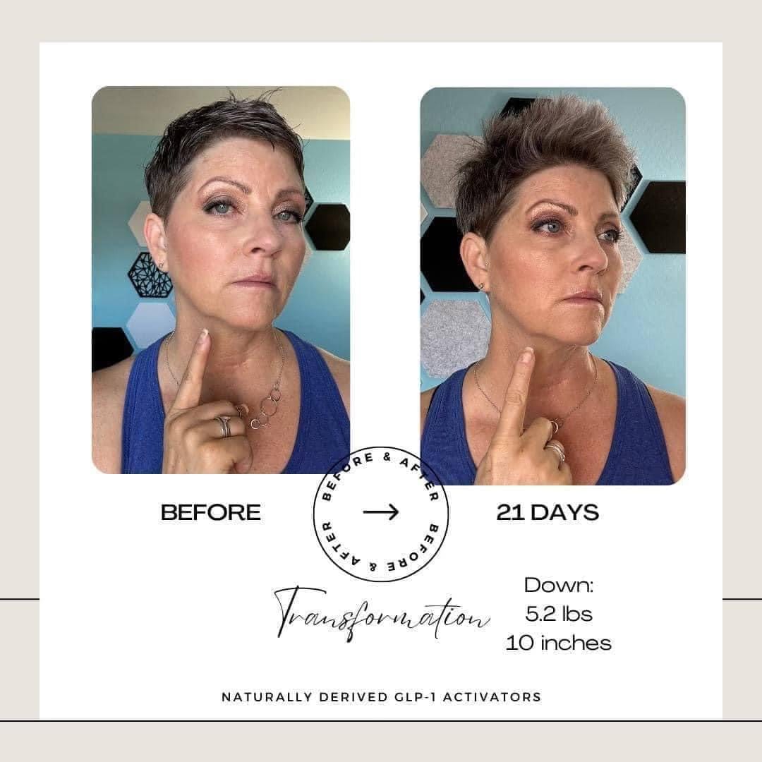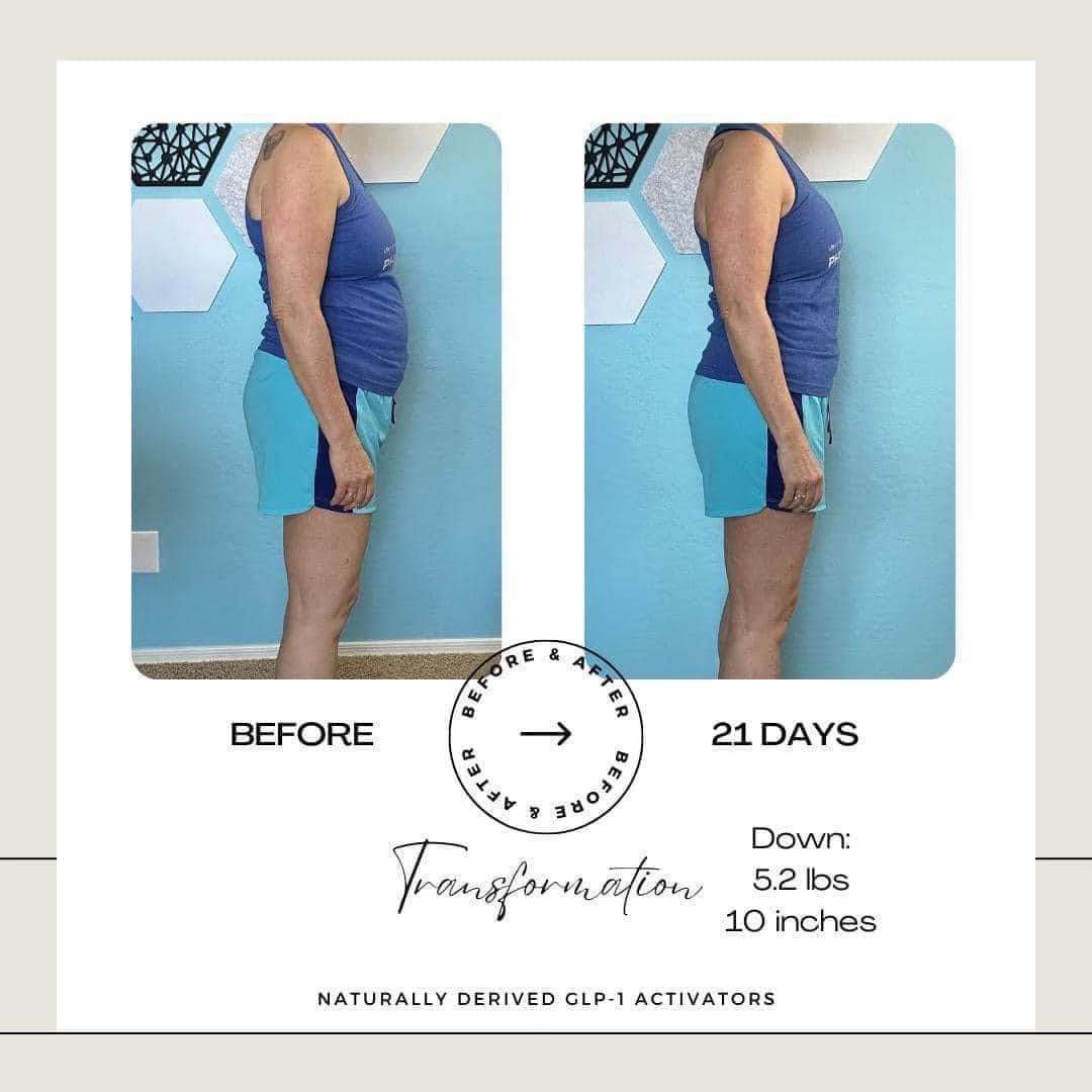 "This is my week 5 update on our new GLP-1 Activation System I am down 13lbs & several inches overall all. I feel a complete difference in my mood, my energy levels, control over my mind with food, zero sugar cravings, and my sleep is off the charts good! I can SEE such a difference and it is reflecting on how amazing I feel."